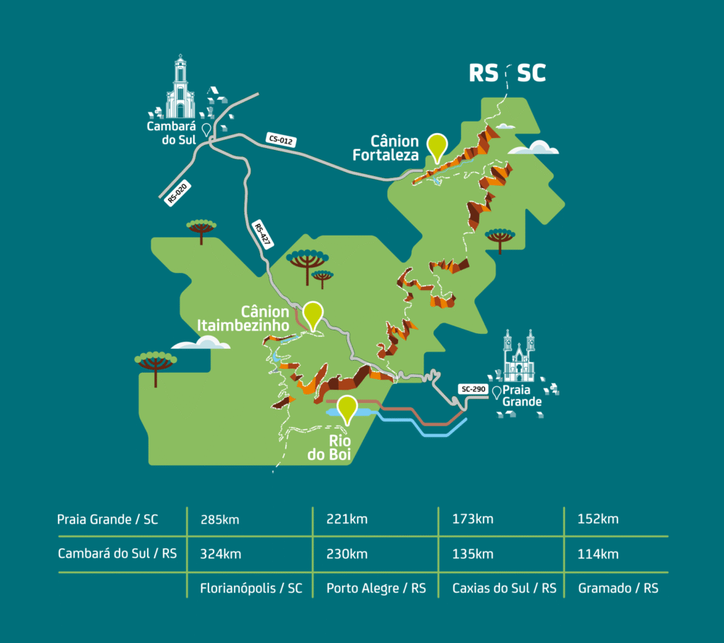 Os Cânions Fortaleza, Itaimbezinho e a trilha do Rio do boi estão localizados entre as cidades de Cambará do Sul, Rio Grande do Sul, e Praia Grande, Santa Catarina. Próximo a grandes cidades como Gramado, Canela, Porto Alegre, Florianópolis e Caxias do Sul.